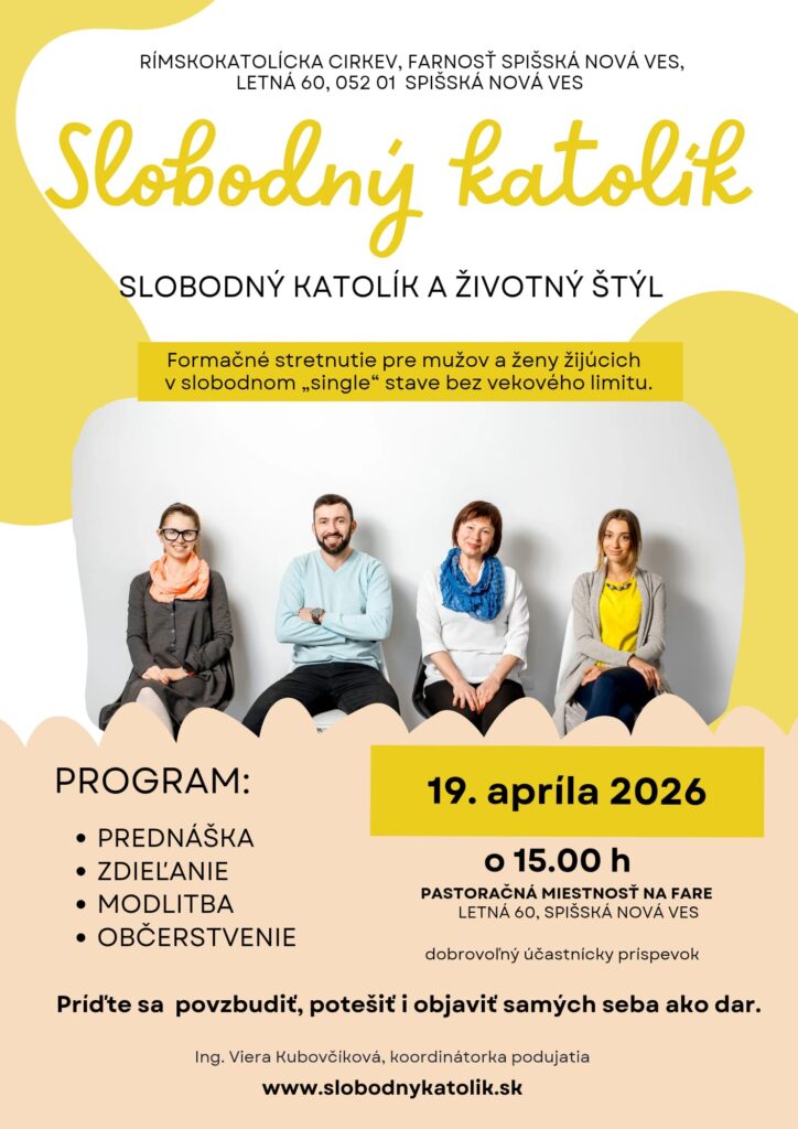 pozývame na ďalšie stretnutie (plagát nižšie) pre ľudí, žijúcich v slobodnom stave. Zároveň prosíme, nezabudnite, že najdôležitejšia aktivita je intenzívna modlitba za slobodných (single) ľudí a dielo pastorácie slobodných.